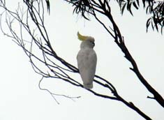 There were big white parrots on the tree. It has a yellow crest which looks