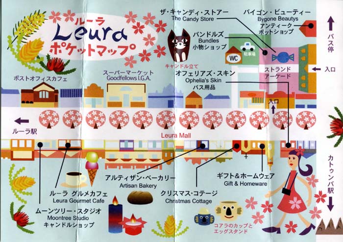 | This is a map of Leura. Though it was a small town, there were many shops: stationers, candle shops, candy stores, antique shops, and kitchen supply shops. Everyone was taking a walk. |