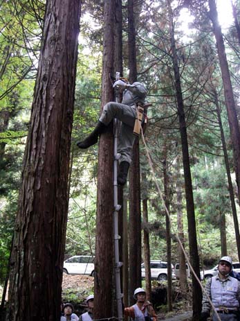 | そして、更にハシゴのてっぺんまで登って、また片足を木に巻きつけて、上体を固定したら、できるだけ上のほうで縄を「ねじ結び」に結び付けます | 「ねじ結び」は正しく結ぶと、強く引けば引くほど締まるという結び方で、簡単に結べる割には、どんなに強く引いても容易に解けない結び方なんだそうです |