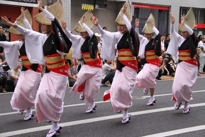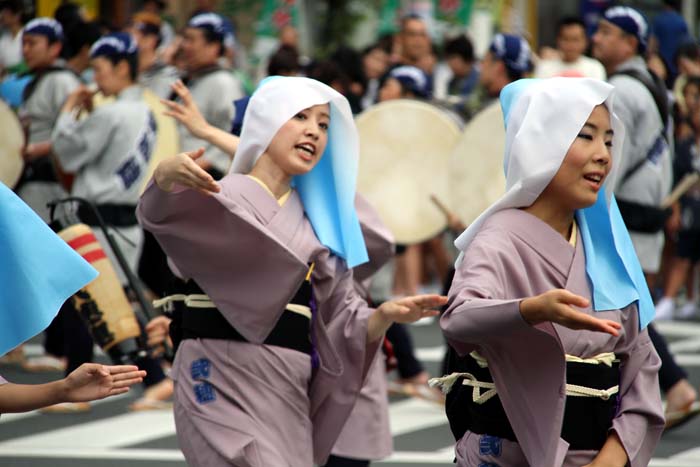 | 踊りに身を任せて踊る弐穂連の皆さん。見物客の混雑した町の様子も伺えて、連員さんたちの掛け声まで聞こえてきそうです。ところで、鍔山先生からいただいた手紙の中に「それにしても、弐穂連の衣装は地味でした。この件については後日、教えてください」とのことでしたので、花柳さんに今度、伺う予定でいます。わたし的には「江戸の粋」をなぞってらっしゃるのかなと思っています(^^)。 |