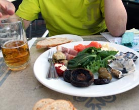 | わたし好みの山盛り状態のウォーターフロント テイスト プレート($48)。BREAD LOAF($5)。おいしくて、ビール($8.20×2)や白ワイン($11×2)が進む | |