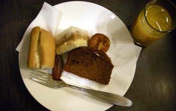 | 白いお皿に取り分けて、テーブル席まで持ってきて食べる。軽食のパンも飲み物も充実している。最後はコーヒーと一緒にデザートで締めくくり。このバルセロナのラウンジが一番ゆったりできた | ||