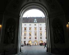 | ミヒャエル門をくぐると、中庭「イン・デア・ブルク(王宮中庭)」が現れる。中央にフランツ1世像。640年間、ハプスブルク家の歴代皇帝がこの王宮で過ごした | ||||||