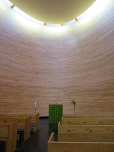 | カンピ・ショッピングセンターの広場に立つ「カンピ礼拝堂」は不思議な形だ。街には全くなじまない。それも、ありえない形だと思う(^^;)。この教会では、ミサなどの教会行事は一切行われず、ただ静寂の中、祈りを捧げるためだけの空間として、市民に開放されている | ||||||||