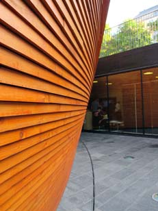 | nabeさんの「ここ、なんなの?」というささやき声さえ、気が引けるほど、木の空間の中は、カタリとも音はなく、静寂な空気が充満していた。神妙にうつむいて、しばし静かに息をしてから、おもむろに外へ出た(^^;) | ||