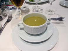| 艦内に、寿司バーを発見。その夜は余りお腹もすいていないので、レストランのフルコースよりも寿司を食べることに。ちょっと高級イメージの店内。時々人が来るが、スタッフさんが別料金だと説明すると、全員、帰って行く(^^;)。スタッフさんは日本人にお寿司を振舞うのが嬉しくて、いろいろアドバイスしてくれる。キリンビールがありますよ、ということで、即注文(^0^)。出て来たミソスープは、スープ皿に入っていて、おまけにレンゲ付き。違うだろと、思わず突っ込みたくなるが(^^;)、味噌汁の味が懐かしくて、おいしかった | ||