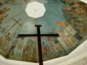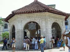 | 「マゼラン・クロス」 ポルトガルの冒険家マゼランが世界一周航海中の1521年セブを訪れ、建立した巨大な十字架と天井画 | 中学の歴史で覚えたマゼランがマクタン島首長ラプラプと戦い、1521年戦死と知り、ちょっと不思議な感覚 | 「マゼラン・クロス」の周りにはろうそくを売る人のほか、カラフルなビーチパラソルのお店も出ていた |
