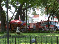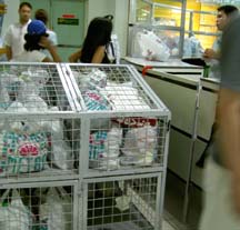 | スーパーのフードセンターは地元の雰囲気が味わえ、料理を見ながら、指で差して注文できるのでお薦め。150ペソ(350円ほど)も出せばデザートまでたっぷり食べられる | 人が並んでいた人気のお店。このおばさんが揚げる衣のついたお肉はジューシーで美味しかった | 袋を持って入ったため、注意される(^^;)。スーパー入り口で荷物係りに荷物をあずけて、スーパーに入る(^^;) |