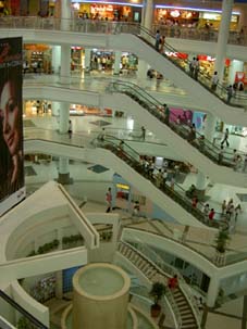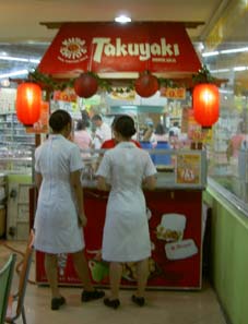 | SM(シューマート)はちょっとしたデパート並み。買い物好きにはたまらない場所?(^^) | ディスプレイが楽しいバナナ売り場。スイカ、メロン、マンゴー、ランプータン、ラムヤイなど果物がいっぱい | 日本の「タコ焼き」なんですが、なぜか「タクヤキ」になってました(^^;) |