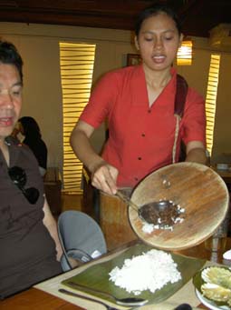 | フィリピンの食事マナーは、右手にスプーン、左手にフォーク(^^)。おかずをご飯に混ぜ、nabeさんは器用に食べる(^^) | 肩から下げたオヒツからご飯をよそってくれる。葉っぱのお皿がいい雰囲気(^^) | |