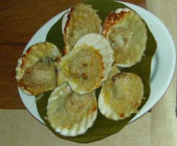 | オーダーはやはりボーイさんと相談。貝を食べたかったので、ほたてのガーリック焼きを注文。ビールのつまみにグッド! | ||