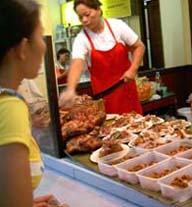 | スーパー内にあったレストラン。ここもお薦め。周りを見渡しても観光客は皆無(^^;)。隣のテーブルをのぞいて、「同じものを」と頼んだら、ひとつ横の肉料理が到着(^^;)。左上の野菜のいためものは一番のヒット。どれに入れるのか、唐辛子が丸ごと届いた(^^;) | ![]() |