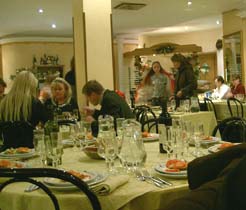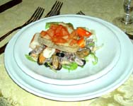 | 時刻が近づき、店内にはディナーを楽しもうとする人々が続々と集結 | テーブルへやってきて目の前で見事なテノール(?)を披露。とにかくサービス満点(^^) | 魚介類が入ったサラダ。なぜかパンまで載ってました(^_^;) | |||