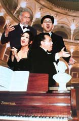 | ピアノに合わせ、3人で絶唱。ストリーに合わせ、衣装を着て歌い踊るのかと勘違い。あ、それはオペラだ(^_^;) | 写真を売り込むため(^_^;)、プロのカメラマンが写してくれました(1枚3000円位)。このカンツォーネディナーは1人9000円ほど。飲み放題でしたので、もちろん、ワインをたんまり頂き、大満足でした(^0^) | ||||