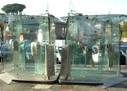 インテリアの国イタリアらしい総ガラス張りの超モダンな電話ボックス。残念ながらここにも落書きが(^_^;) |