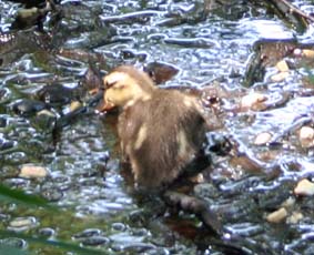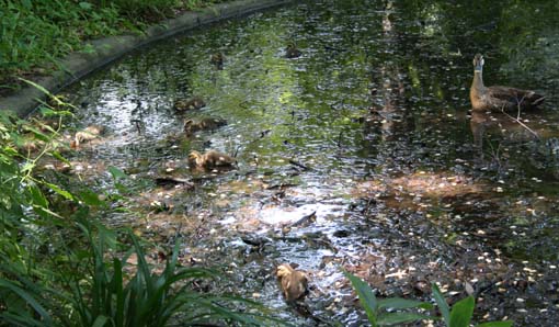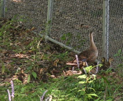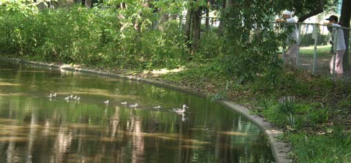 | ヨチヨチと池から這い上がって、女の人のいる金網へ全員集合(^^) |