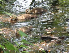 上の画像を一部アップにしてみました。 ヒナはちょこまか動いているため、ピンボケですが(^^;)、首をこんなに伸ばして、池から這い上がるんですね。 |