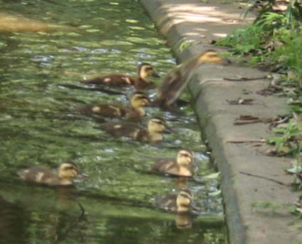 | 右手で親鳥が辺りを見張っています。子ガモたちは池の中に首を突っ込んでは、えさをついばんでいます。ちょっとわかりづらい画像となってますが、この場所は特に池の水面にコケや水草が生えていて、ちょっと汚い場所なんですよね(^_^;)。 カルガモは雑食とか。アメンボーがスイスイ泳ぐこの池には、昆虫も小魚もいっぱいいるのかもしれませんね。 そうそう、双眼鏡のおじさんは持て余したお米を時々あげているそうです。 |