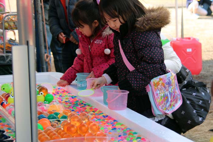 | 色とりどりのゴムボールをすくっている女の子たち。なかなか紙がやぶけず、10個以上ゲットしてました(^0^) |