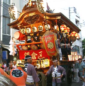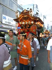 | 実はうちわ祭には踊りがありません。裃(かみしも)をつけた先陣が通り過ぎると、次にちょうちんを持った女性陣が進み、次に男たちに引かれた屋台が現れます。 踊りがない分、華やかさにちょっと欠けるかな?(^_^;) |