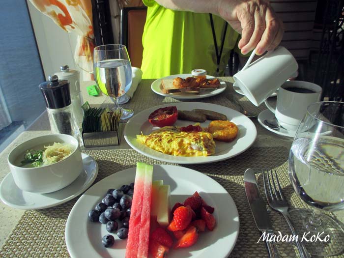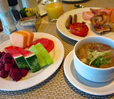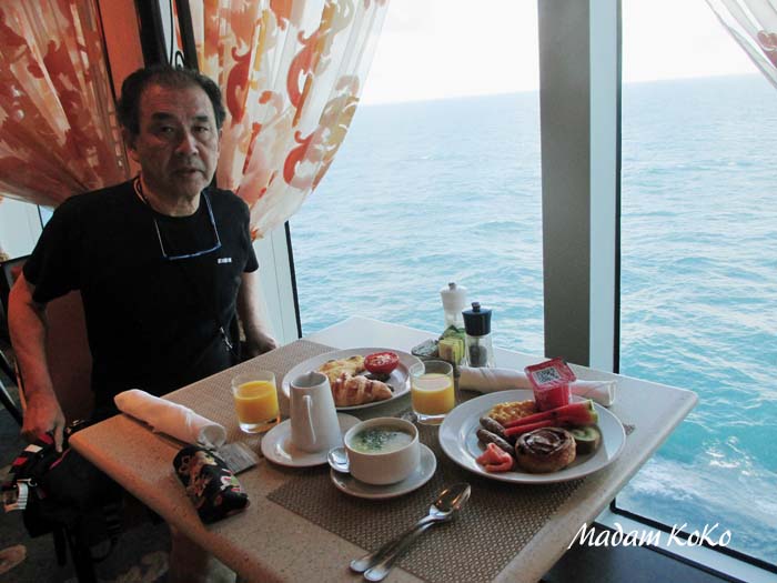 | カフェテラスで海を眺めながらの朝食・・・ぜいたくなひとときだ。毎日、食べすぎ状態だったので、弱った胃に「チキンのお粥(Chicken Congee)」は優しくて、おまけにおいしかった。他にもオレンジジュース、ベークドトマト、ウインナー(やみつきの味)、果物は毎日テーブルに並らんだ | |||