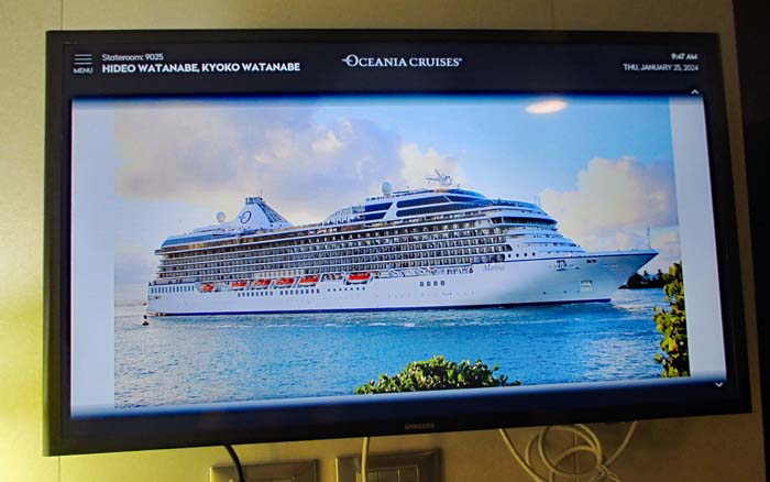 | キャビンにあるテレビはたくさんの情報を知らせてくれる。もちろん映画も大いに観たが、現在の進路状況や、船の前方の景色(その日の天気がわかる)や、今日一日のイベントなどを見ることができる。特に耳の悪いわたしは、艦内のアナウンスが廊下越しではよく聴こえず、テレビから艦内放送を聴いた。また特に乗船した当日はまずテレビで避難情報を見てから、指示通りの階へ行き、チェックを受ける必要がある |