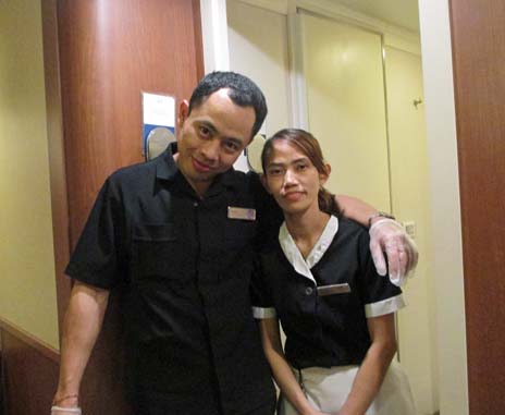 | ルームキーパーはフロアーごとの担当で、二人ひと組で部屋の掃除をしてくれる。多い時は一日3回も、4回もきれいにしてくれる。優しいお姉さんタイプの彼女はフィリピン出身のリナニエ(Lilanie)。nabeさんはさっそくタガログ語で「サラマ(ありがとう)」」と挨拶して喜ばせていた。いつもお茶目なデワ(DEWA)はバリ出身。インドネシア語「テレマカシ(ありがとう)」とnabeさんに挨拶されて、ありがと