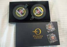 ございまーす、と応えていた。 彼らのお蔭で一歩部屋を出ると、陽気な挨拶の言葉が飛び交ってきて、元気がもらえた ※右下画像はオーシャニアの記念品。りっぱな箱入りのネームプレートとバッチ。今までたくさんのクルーズ船に乗ったが、記念品をもらったのは初めて! |