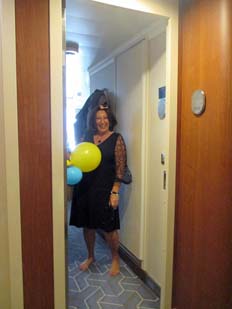 | 持参した100均の磁石のフックは便利でお薦め。白い携帯ライトも物探しで役立った。※鏡の右横のコンセントは日本と同じ形で超便利 | お向かいさんのキャビンのドアに「お誕生日おめでとう!」の風船とメッセージがあった。ちょうどお出かけ前のご婦人がドアを開けたので、「Happy birthday!」と声をかけることができた(^0^) | ||||