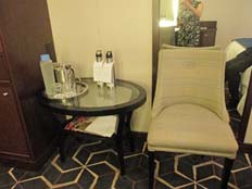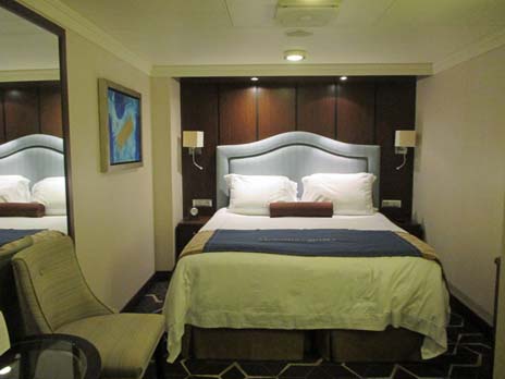 | キャビン内はラルフローレンによるデザインとか。ベッドはキングサイズ。ベッドの両脇のサイドテーブルは収納やミニテーブルとして役立った。デスクも広く、収納も多く、お化粧時にライトが付くので便利。丸いテーブルには常時ミネラルウォーター(Vele)と持ち運び用のステンレスボトルが置いてあり、ミネラルウォーターは毎日補充してくれる。ベッド下にトランク収納可。丸いテーブルと椅子2脚があるので室内でもゆっくり食事が楽しめる | |||