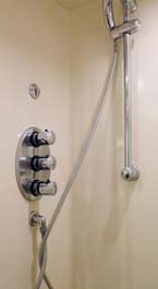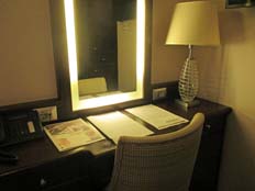 | 洗面所は大理石調の壁でしゃれたデザイン。化粧品なども両サイドの鏡の奥の3段の棚があり整理しやすい。唯一、残念だったのはnabeさんにとってシャワー室が狭かったこと。ただガラスの扉がドアのように開閉するシャワールームなので、シャワーが外へ漏れることはなかった | ||||