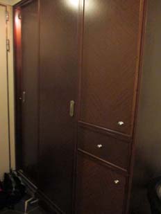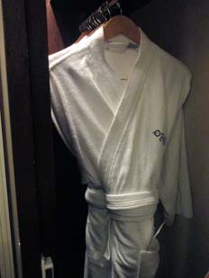 | <上>ロゴ入り革の置時計。持ち上げるとライトが付く <下>綿100%の分厚いロゴ入りタオル | クローゼットには引き出しがたくさんあり、洋服掛けもたっぷりサイズ。上段には救命胴衣 | ロゴ入りバスローブ。シャワーの後に使ったら、ちょっとリッチな気分が味わえた(^_^;) | |||