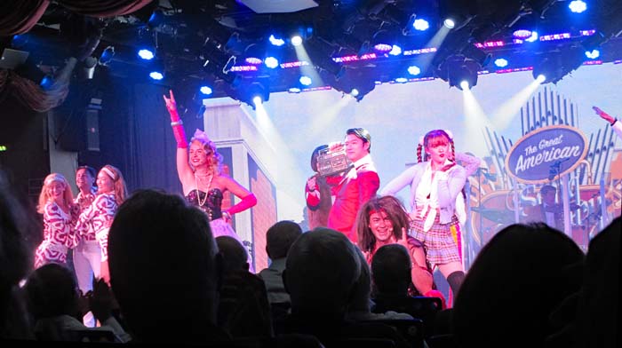 プロダクション カンパニー」の若い人たちがたくさん出演する、歌あり踊りありのショー(画像)は唯一楽しめた。歌も踊りも素晴らしくて、元気いっぱいのショーに思いきりの拍手を送った(画像)。 ところで、オーシャニア・マリーナでは混むことはほとんどない。ショーが終わった時だけ、一斉にエレベーターにゲストたちが集中するぐらいだ。また例え、エレベーターが混んでいても皆さんニコニコ。誰かが冗談を言って笑わせてくれる。「Good evening!」の挨拶をなぜかまちがえて、元気に「Good night!」と挨拶してエレベーターに乗り込んでしまった時は皆さん、大笑いで歓迎してくれた(^_^;) |