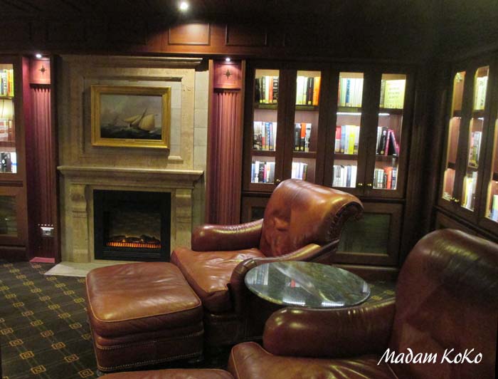 | パズルをした場所の隣りはライブラリが3室ほど続く。英国の地方のお屋敷をイメージして造られたというライブラリ。2000冊を超える書籍や雑誌が取り揃えてある。せっかくなのでライブラリーの中にはどんな本があるのか、nabeさんと探検すると、よく読み込まれた日本の分厚いガイドブックがあった。ゲストたちと話をすると、日本を旅行された方が非常に多い。しかも旅行先が多岐に渡っているので逆に私たちが驚かされた |