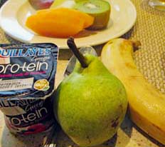 | 日課のお粥(チキンやビーフ)をニー(Ni)からよそってもらう | 朝食では果物をたっぷり摂る。南アメリカは果物がおいしい | お粥に長ネギ(Green onion)と生姜(ginger)の追加がおいしい | ||