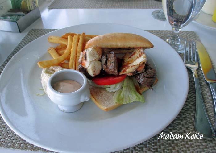 | ランチタイムになると、テラスカフェの他に、グリル料理の「ウェブズ(WAVES)」が開く。「サーフ&ターフ」というロブスターと牛フィレ肉をはさんだハンバーガーが人気だ。「サーフ&ターフ」というのは、海のグルメ「ロブスター」と陸のグルメ「牛肉」を組み合わせたもので、海と陸のものを一辺に食べる、言わば欲張りバーガーのこと。わたしはブレずに毎回「サーフ&ターフ」を食べ続けたが、nabeさんは和牛の神戸バーガーやクラッシックバーガー、マグロバーカーなど、食べ比べをしていた。表面だけ焼いたマグロの厚さが半端じゃなくてnabeさんはたまげていた | ||||